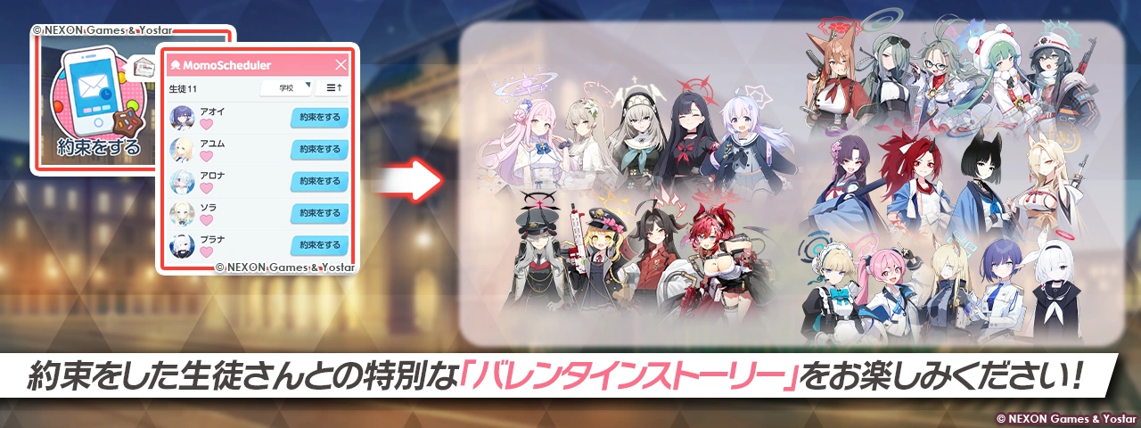 Teachers can make a promise with several special characters such as: Arona, Plana Rin, Momoka, Ayumu, Aoi, and Sora.