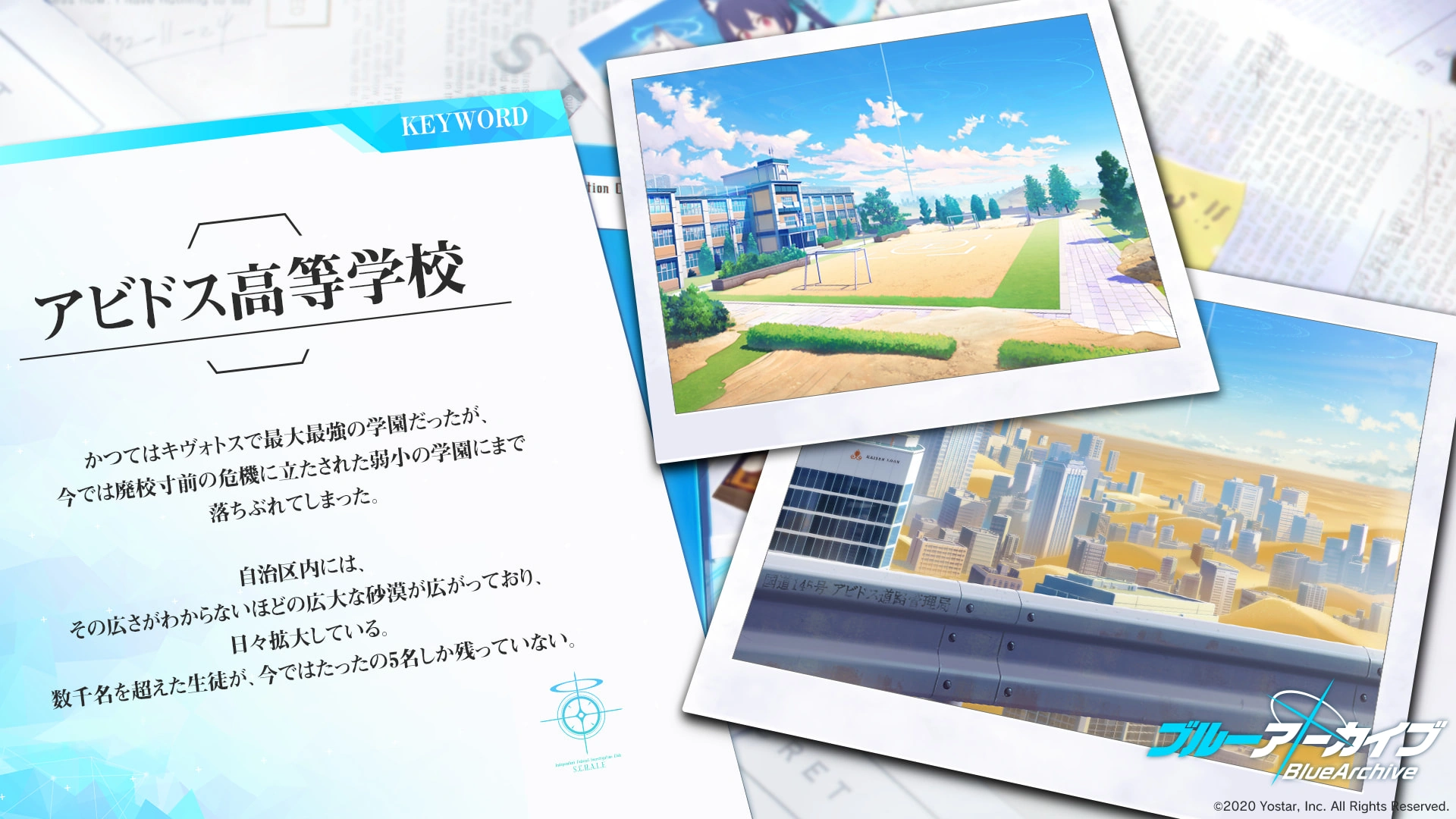 Once the longest running school Kivotos, Abydos High School is now in debt. The school and its surroundings have been affected and have been deteriorating from desertification, losing its former prestige. Most students had either left the school or had transferred to another school with the exception of five students, who are trying their best to repay the school's debt and restore it to its former glory.