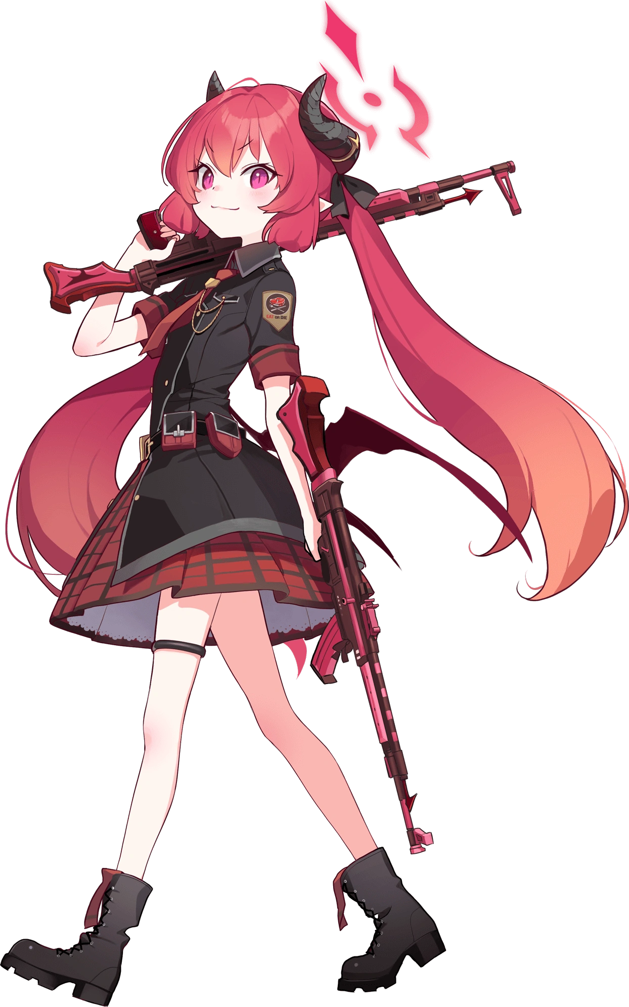 She has red bob-cut hair with long twintails below shoulder-length tied to thin black ribbons. She has ram horns, pointy ears, red devil wings on her back and scarlet demon eyes.