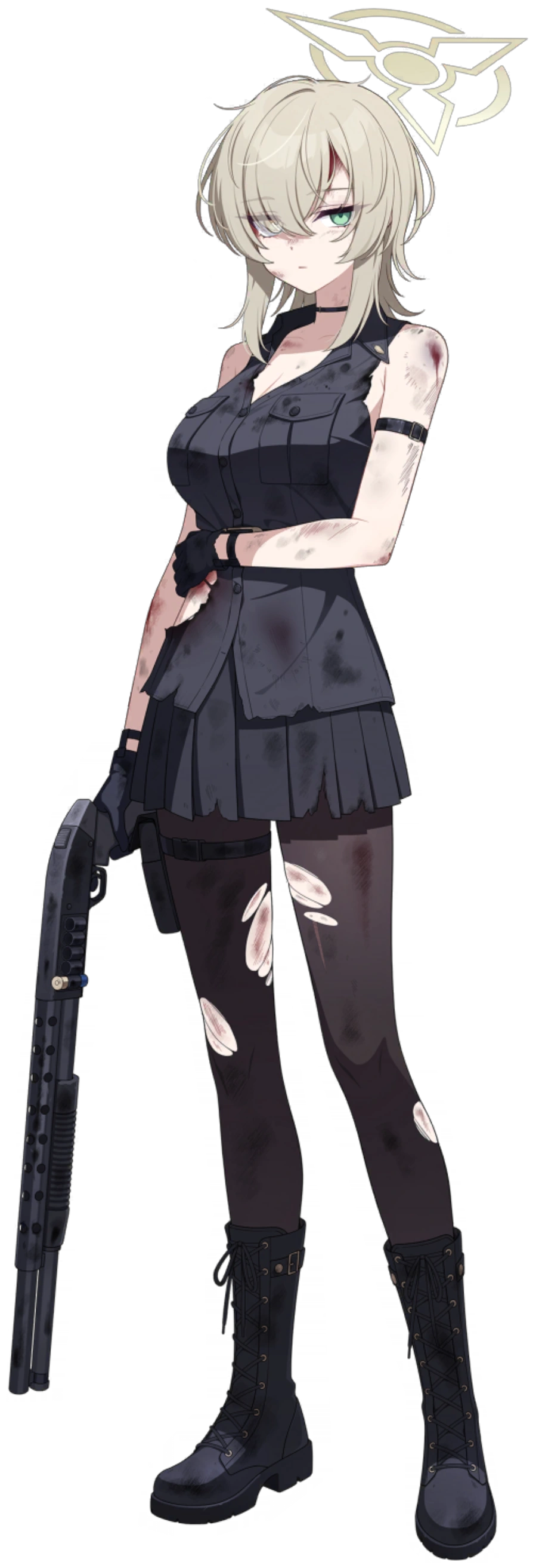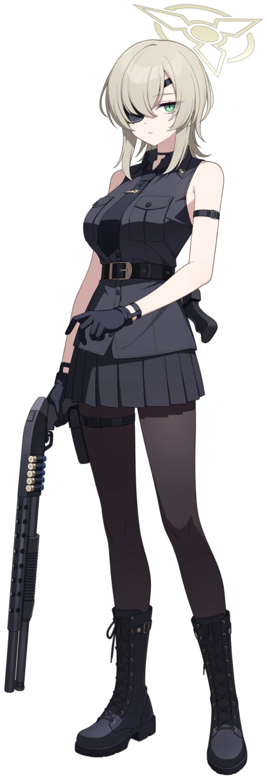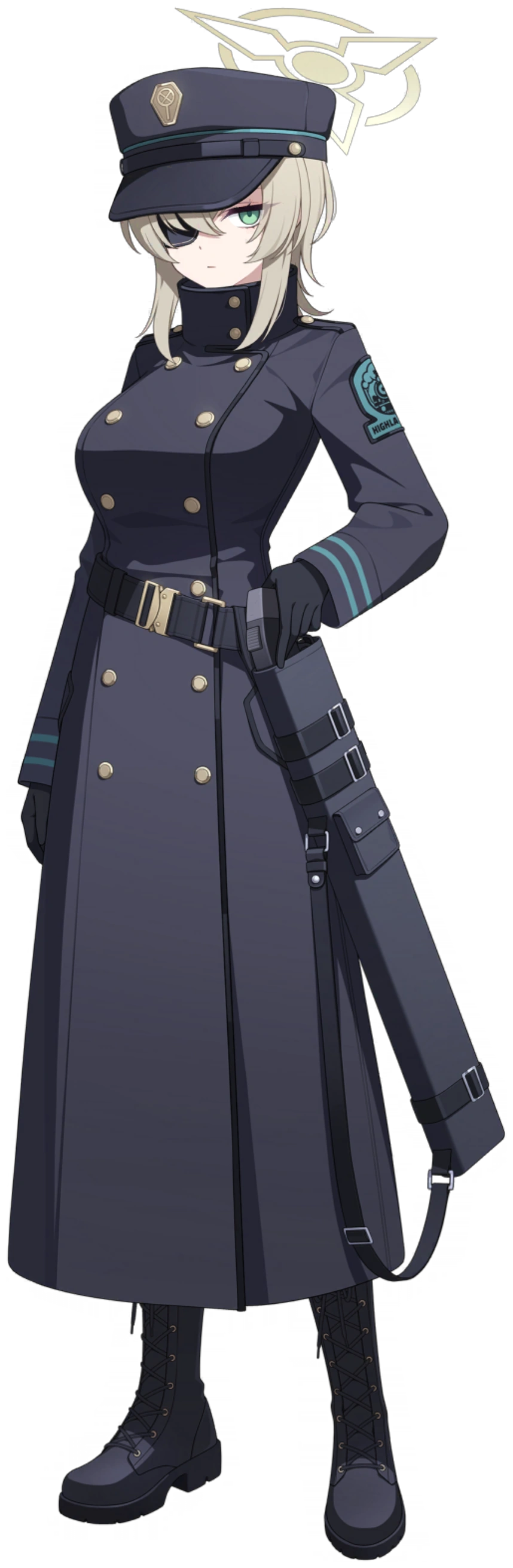 Asagiri Suou's attire reflects practicality and functionality, with a black WW2 trench coat serving as her main outerwear. Alongside, she sports a matching color visor hat, alongside her shotgun holster that resemble a sword sheath, adding a touch of uniformity and authority to her ensemble. Her choice of footwear consists of simple black mid-calf boots.