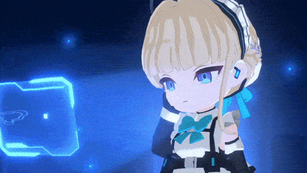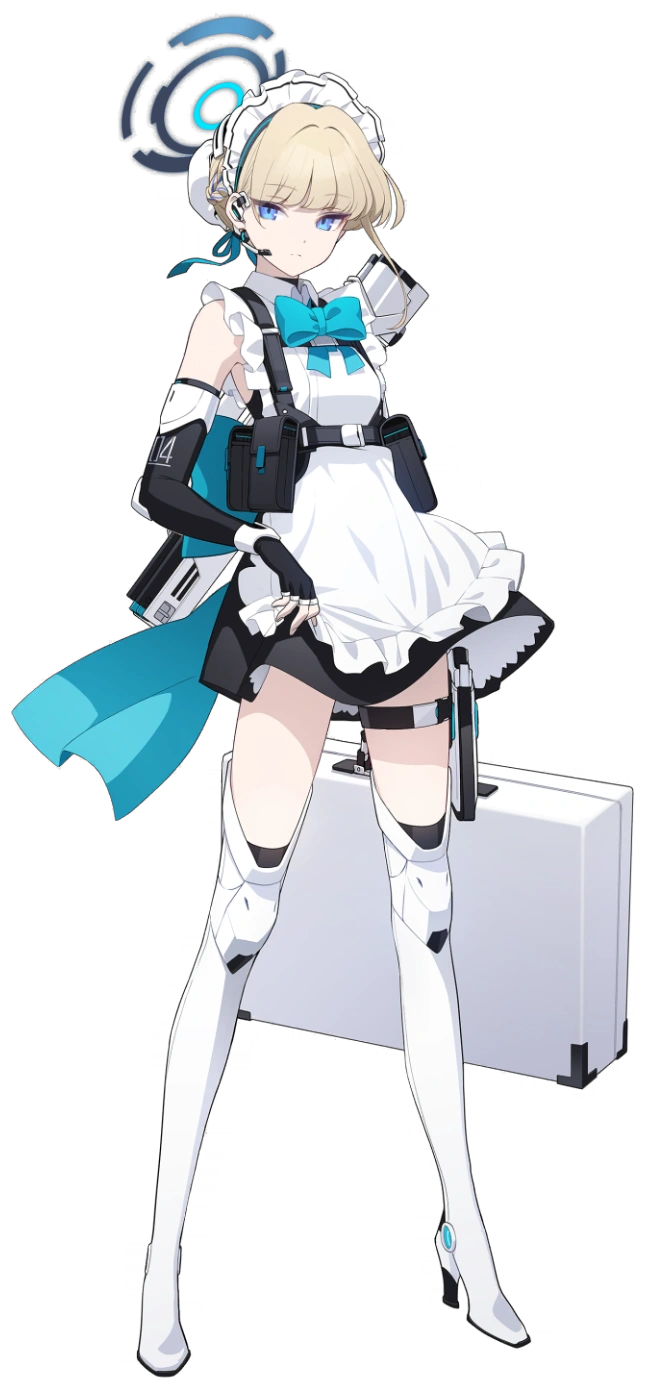 Toki's Mode 1 uniform is a regular maid uniform. Paired to her uniform is a white apron, a small blue ribbon, a black dress with white trim, a large blue ribbon at her back, an outer skirt, black fingerless elbow gloves with white rings, black web gear with blue parts, and long white high-heeled shoes with black heels and a blue circle on each shoe.