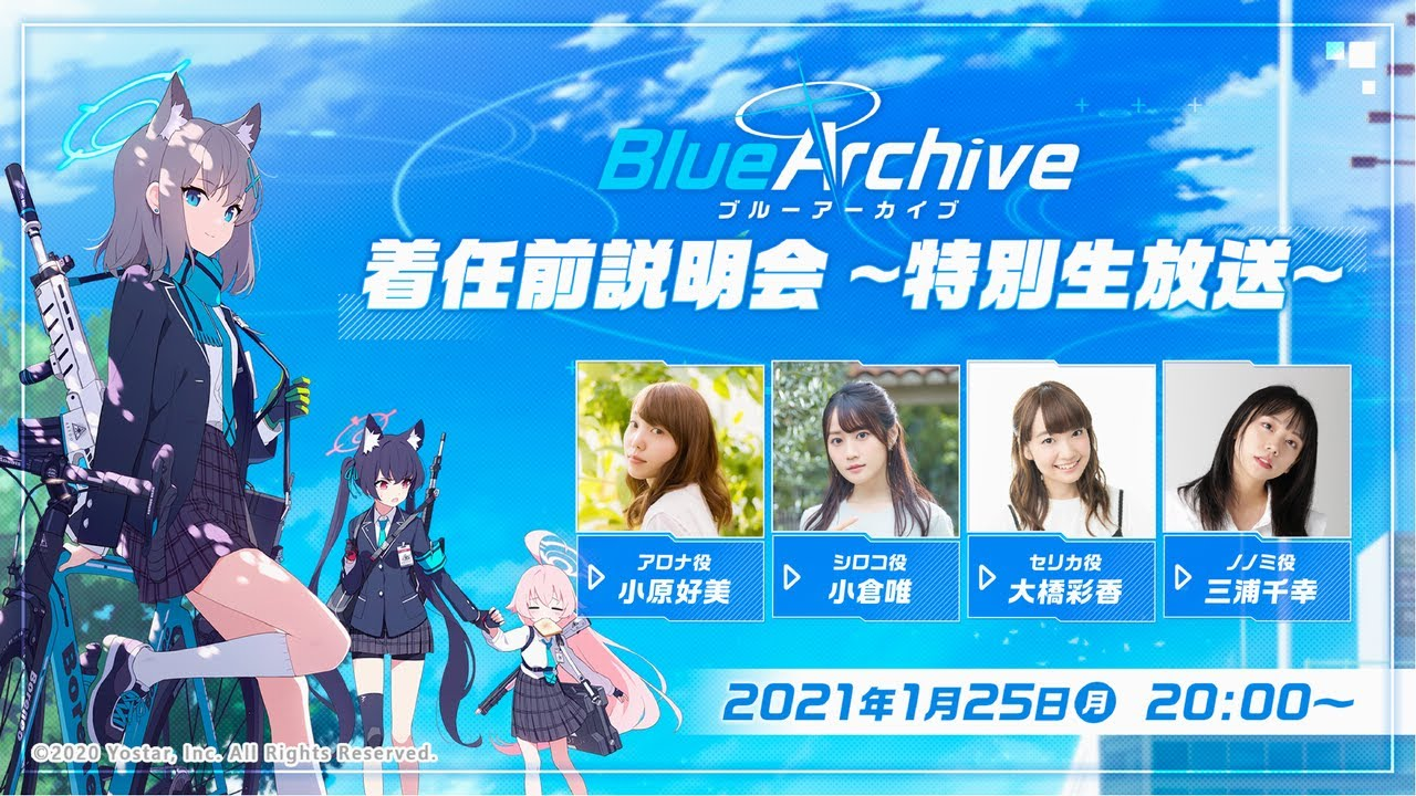 Blue Archive Pre-Arrival Briefing - Special Live Broadcast (『ブルーアーカイブ』着任前説明会~特別生放送~,Blue Archive Pre-Arrival Briefing - Special Live Broadcast) is the 1st livestream celebrating the upcoming release of Blue Archive on February 5th, 2021.