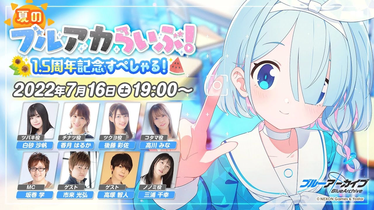 Summer Blue Archive Live! - 1.5 Year Anniversary Special! (夏のブルアカらいぶ!1.5周年記念すぺしゃる!,Summer Blue Archive Live! - 1.5 Year Anniversary Special!) is the 7th livestream.