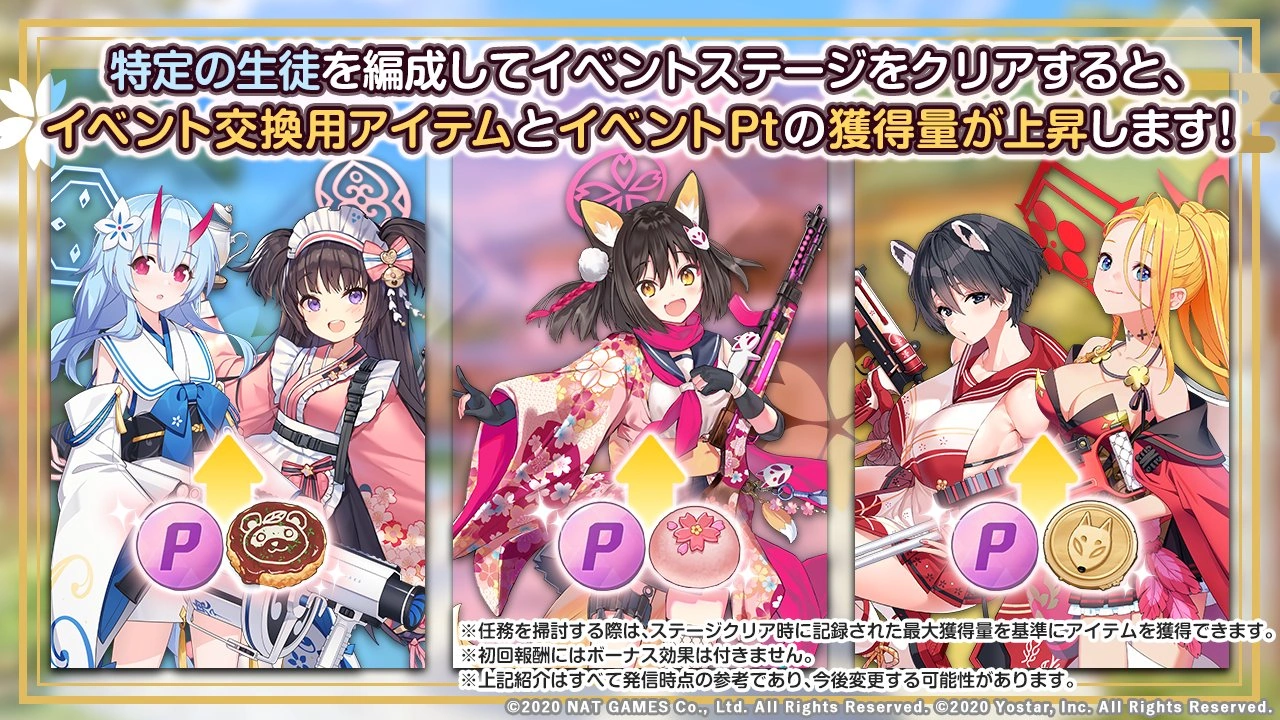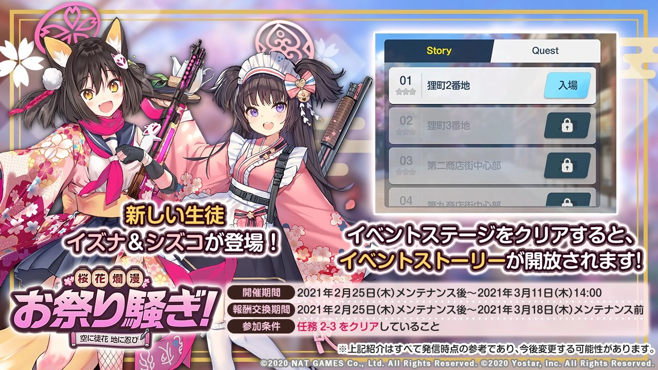 Cherry Blossom Festival ~Flowers in the Sky, Ninja on the Ground~ (桜花爛漫お祭り騒ぎ!~空に徒花 地に忍び~) or Cherry Blossom Festival Commotion! on Global, is the 1st event in Blue Archive that is set on Hyakkiyako featuring Kuda Izuna, Kawawa Shizuko and Asahina Pina.