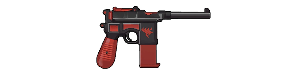 She uses a black Mauser M712 Schnellfeuer pistol with a brown grip, magazine and bolt carrier. A brown Gehenna insignia is stamped on the mag well.