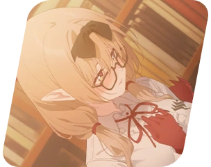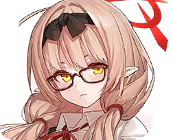 She has long shoulder-length blonde hair tied in pigtails with red bands each and black ribbon hairband. She has elven ears and amber eyes with black glasses.