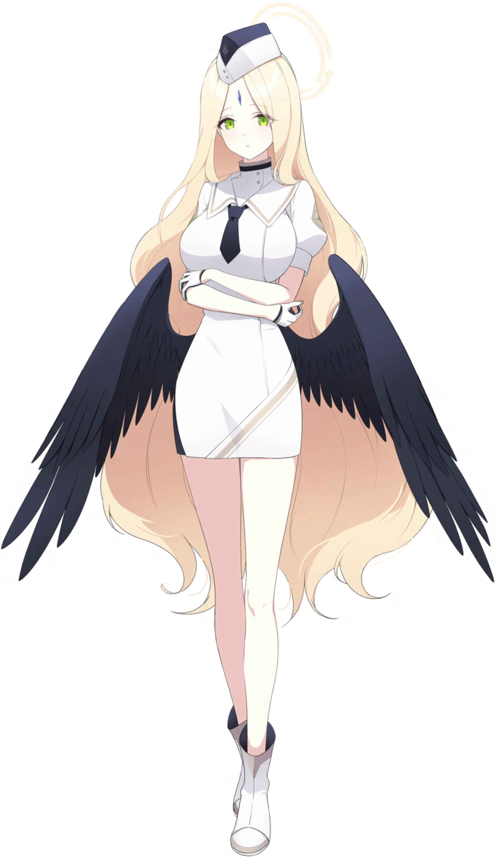 Ayumu has long wavy blonde hair and green eyes. On her forehead is a blue crystal and two black, angelic wings that extend from her lower back.
