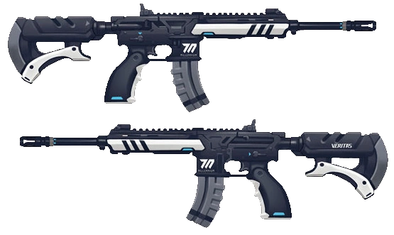 She uses a navy blue M27 Infantry Automatic Rifle with a white handguard and a grey magazine. The Millennium insignia is stamped on both sides of the mag well. The Veritas' name is imprinted on the left side of the cheek rest.