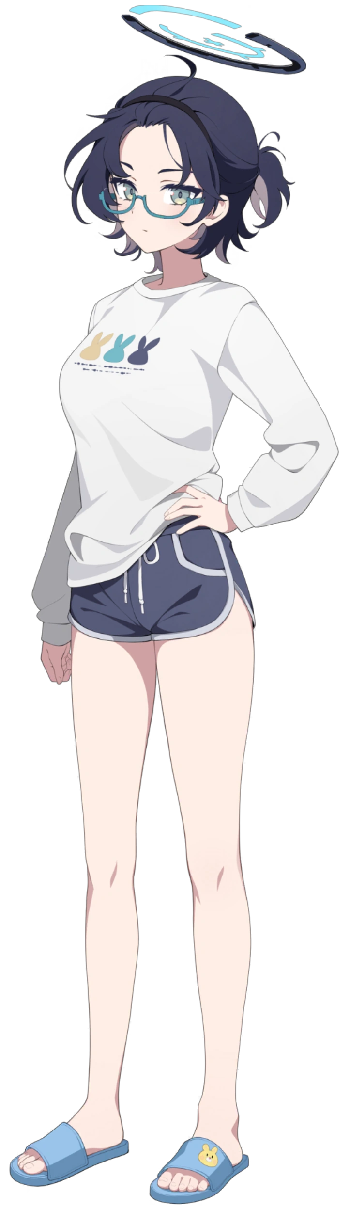 Her halo is cyan in color; in the middle, and next to the middle it is grey-blue color. Her halo reassemble a three quarter circle, in the half is a full circle with three little lines, with a plus in the middle. Over the sweeter and dress shirt she wears a white jacket with black sleeves. She wears long black socks and white shoes. She also wear some accessories, like; a clock on the hand and a little yellow bunny plush at the edge of the jacket.