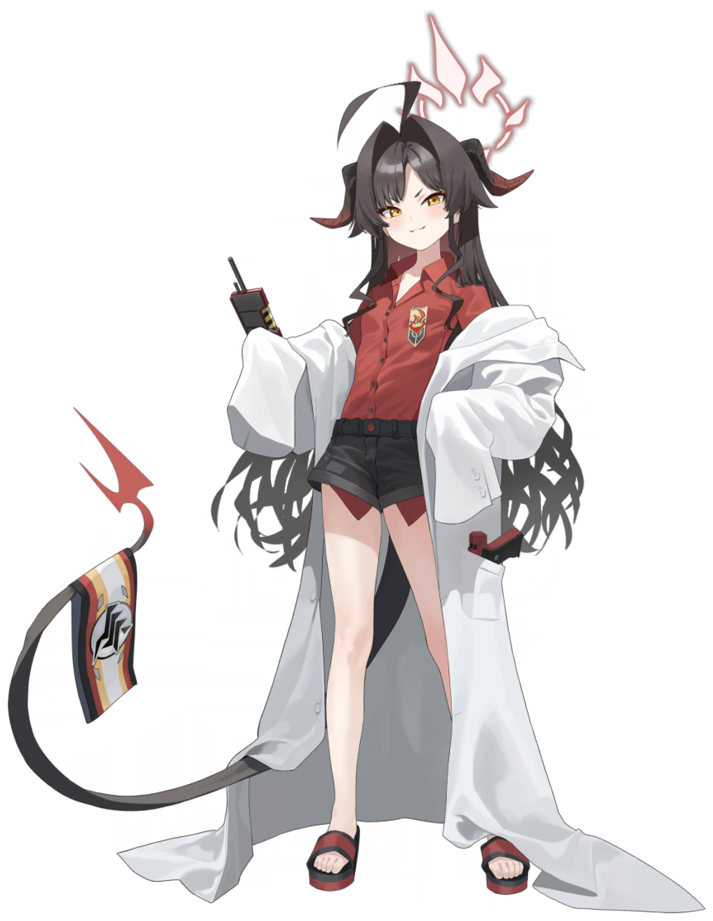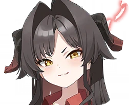 Kasumi has messy, thigh-length dark brown hair with fitting bangs and golden eyes. She has an ahoge and two dark brown horns with dark red tips on the back of her head. Additionally, she has a tail, with its end resembling a two-forked trident.
