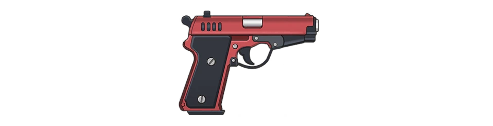 She uses a red Walther model Volkspistole handgun with black grips and trigger.