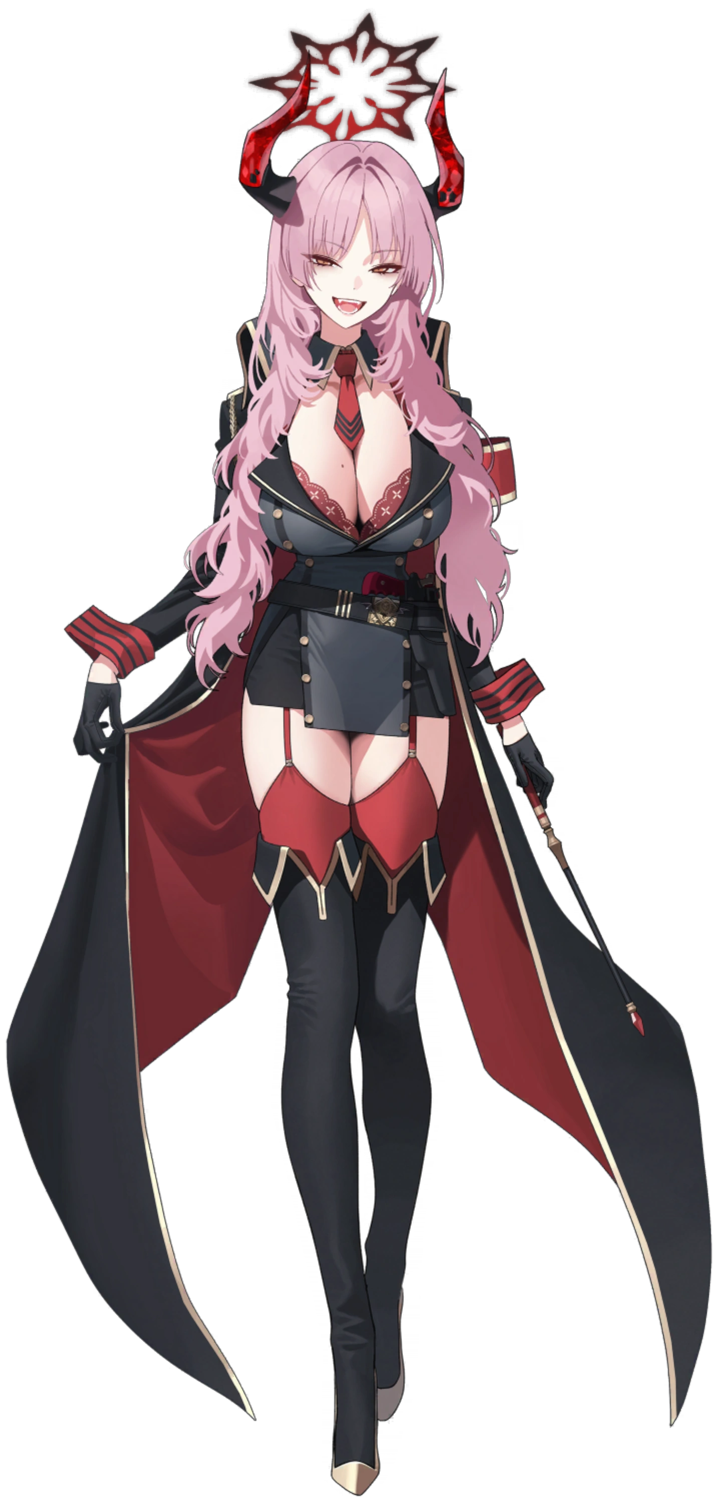 Satsuki wears a black short dress which reveals her cleavage and has two opening at the thighs. She also wears a little red tie, a black military coat with golden accents, red thigh-high socks and knee-length black boots.