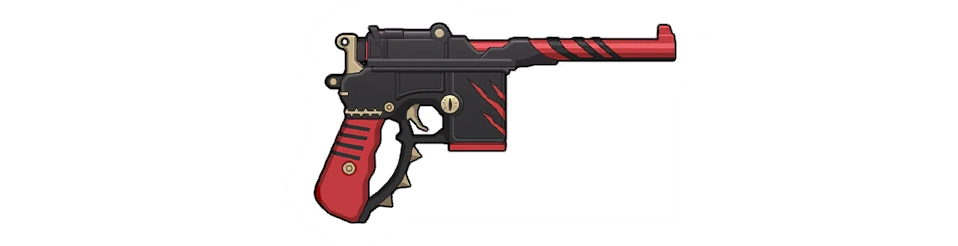 She uses a black Mauser M712 "Schnellfeuer" pistol with a red barrel, magazine, and grips. The hammer, magazine release catch, and trigger is painted brown. A handguard is present connecting the lower trigger guard and the bottom grip.