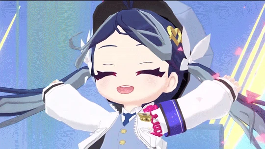 Fubuki has navy blue and light blue hair and vibrant red eyes, her hair is styled into twintails with fitting bangs.