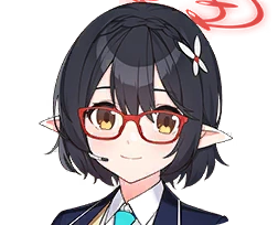 She has black bob cut hair with bangs and a French-braid styled headband that matches her hair color. She wears red glasses, white butterfly hairpin with red stud and a speaker earpiece. She has elven ears and amber eyes.