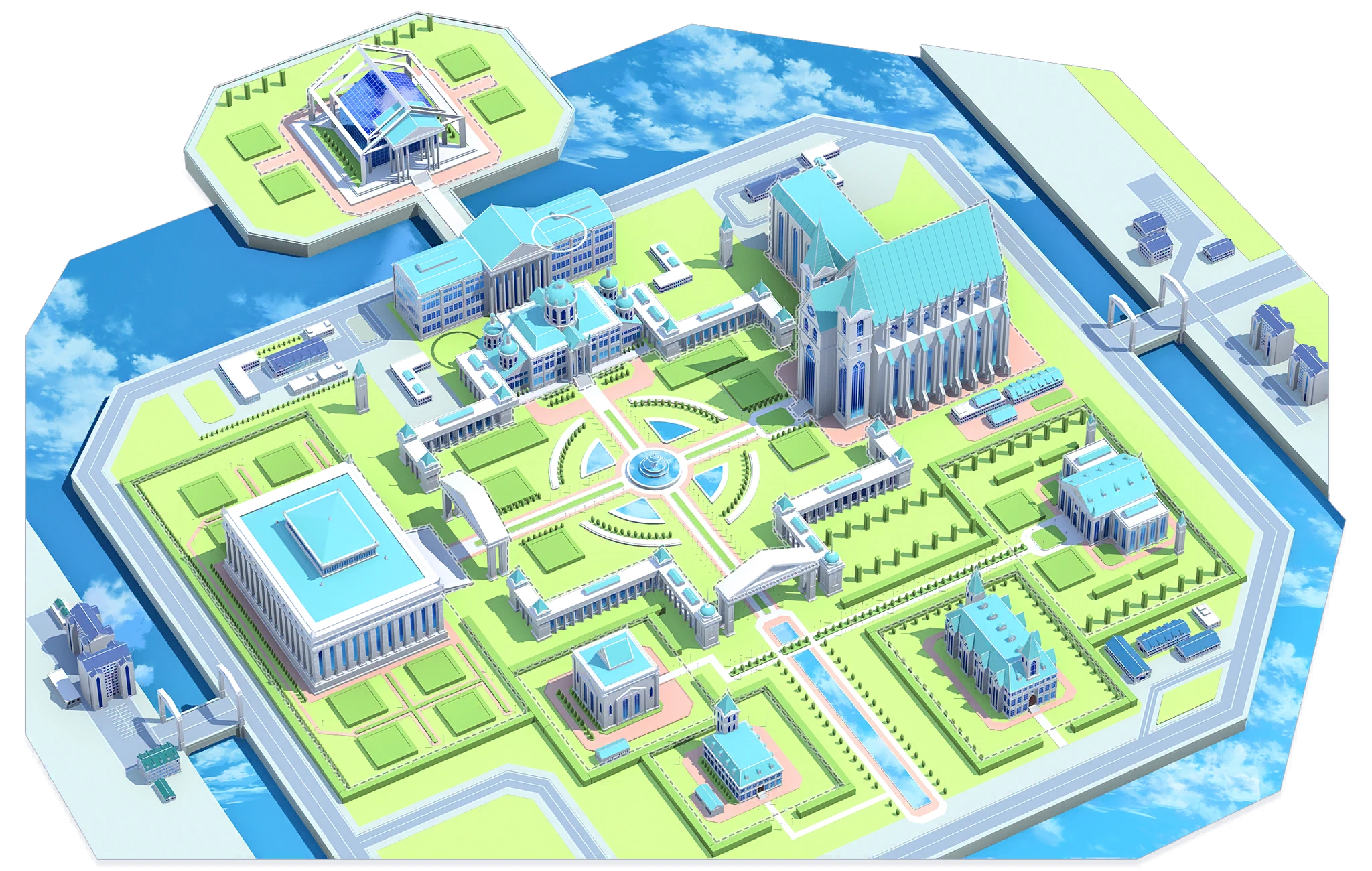 | Trinity Cathedral is the largest building in Trinity and is truly the symbol of Trinity. It is also the headquarters of the "Sisterhood". | This is the square in the center of the city, which is also the name of the area. It is a popular place for Trinity students to gather, especially the beautiful fountain in the center, which is so famous that even those who are not familiar with Trinity know it. | This is the largest library not only in Trinity, but also in Kivotos. Because of its size and complexity, it is rumored that some students sometimes get lost in this building. | |