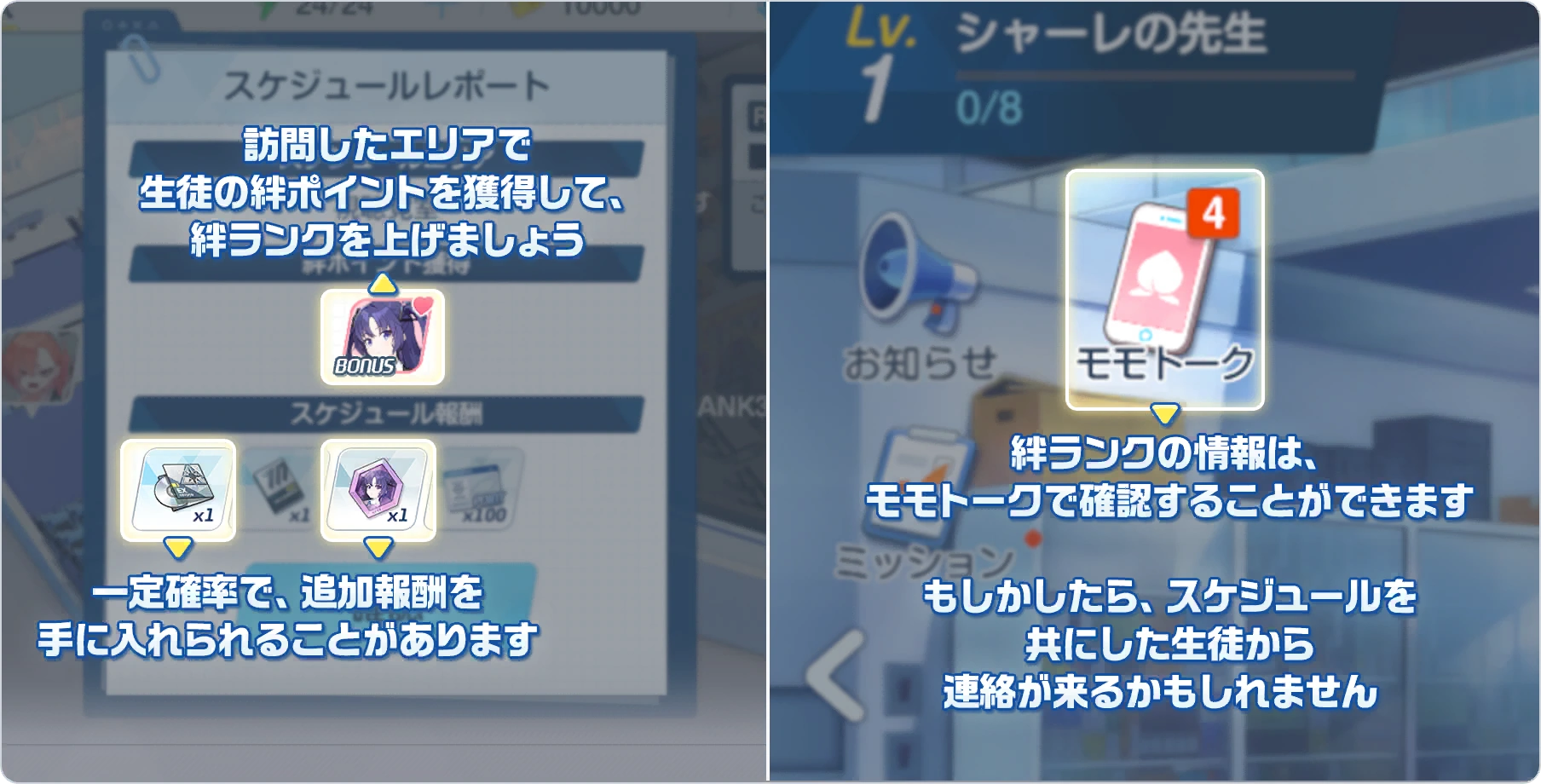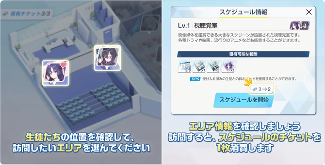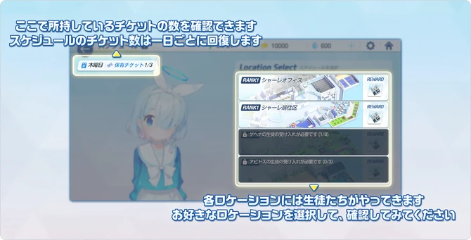 Schedule (スケジュール) or Lesson in the Global release, is a feature that allows Sensei to "check" around in both the Schale office and the several schools within Kivotos.
