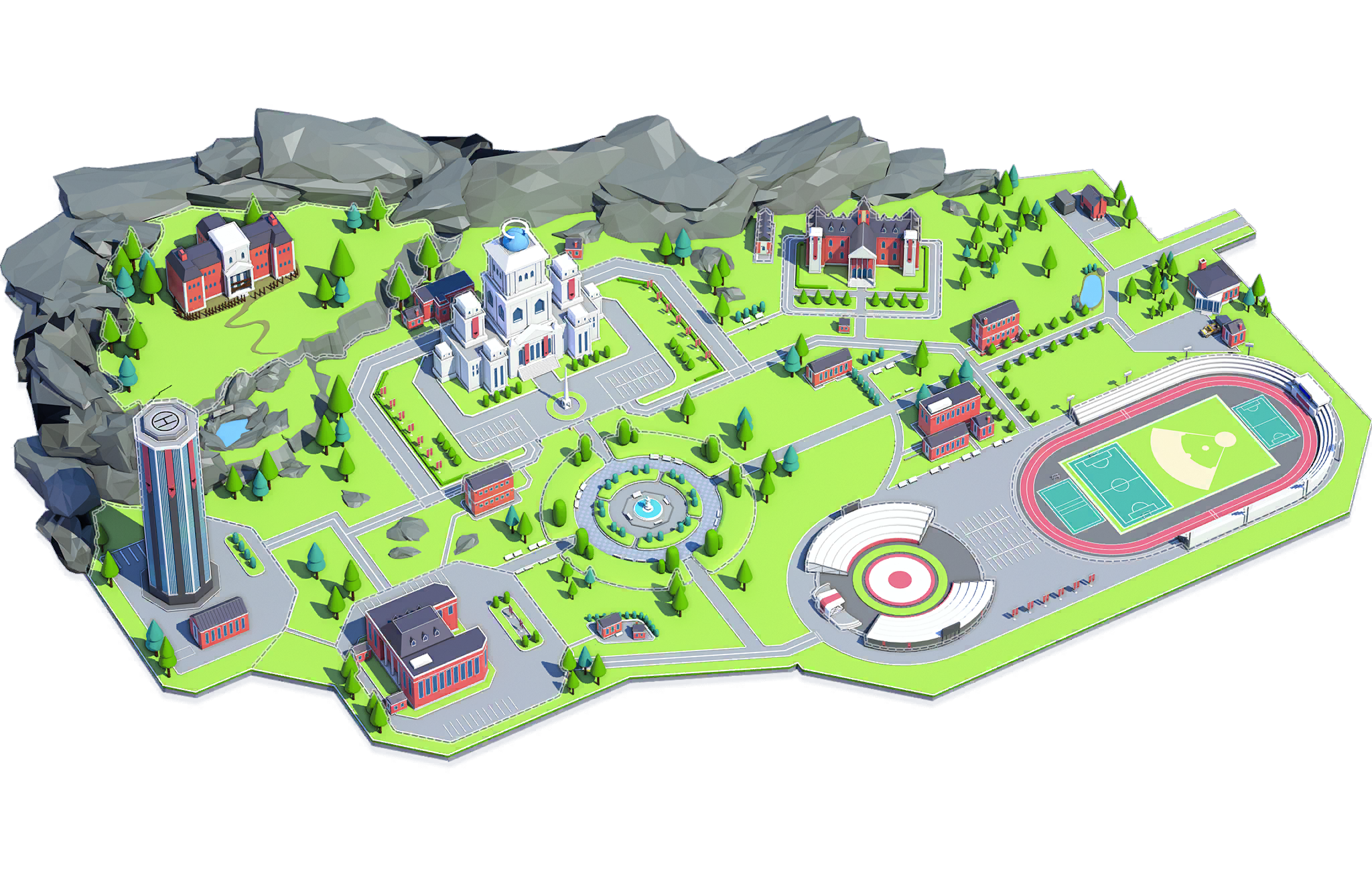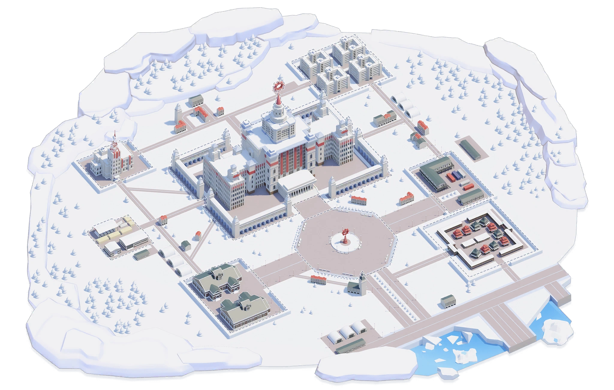 | The main building where the Red Winter Office is located. There are mustache sculptures everywhere that symbolize the authority of President Cherino. | A huge plaza near the Red Winter office building. In the center of the plaza stand a giant statue of Cherino that is illuminated 24/7. | A shared dorm complex built for the residence and convenience of students. It's cheap, but hot water is rarely available due to the facility's age. | |