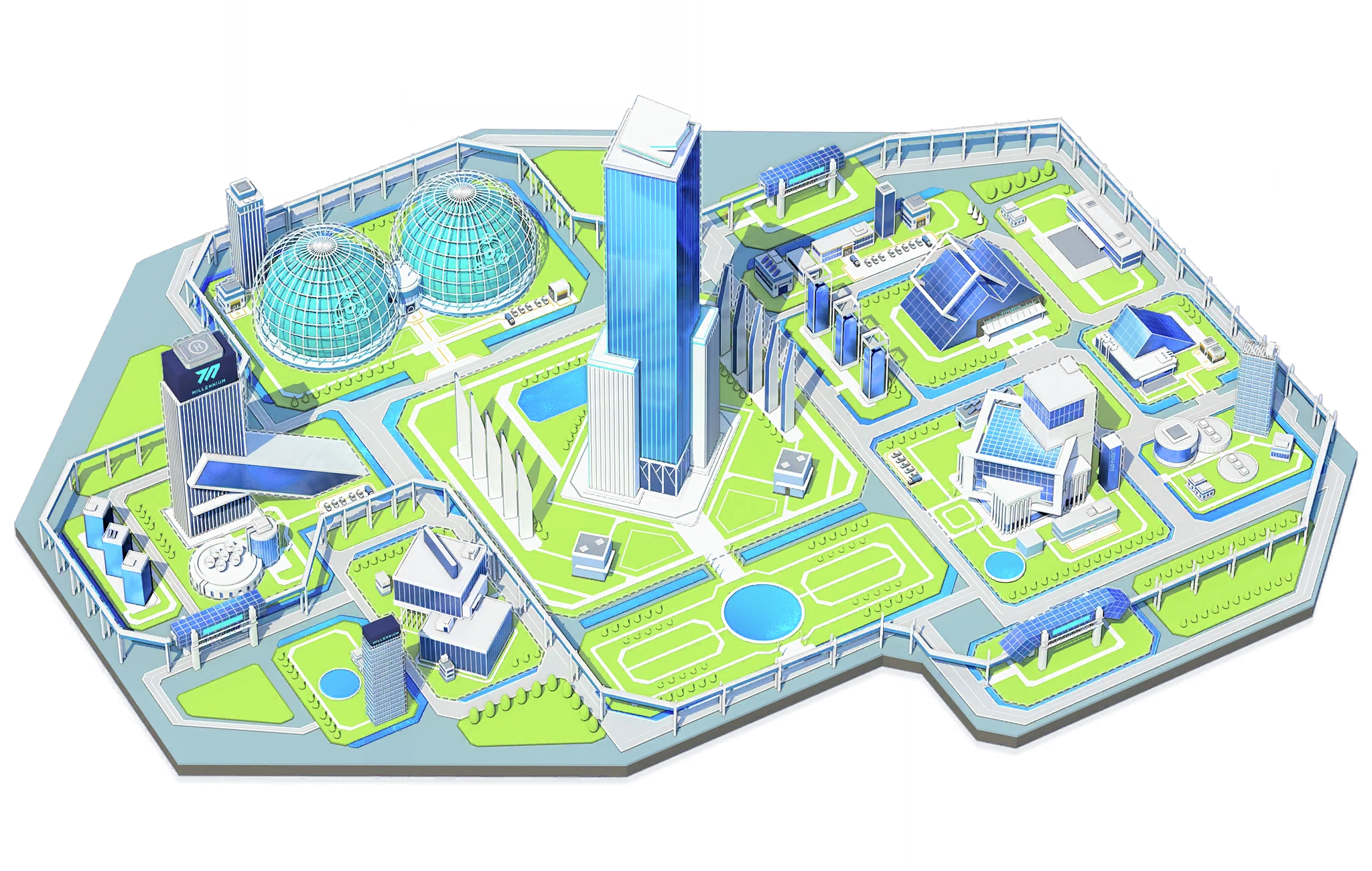 | A business district located next to Tri-Square. It's a modern and stylish area made up of a maze of streets and corporate buildings. | The home to one of the biggest art galleries in Kivotos. Besides that, the avenue itself is full of art. It's a must-see. | A large, peaceful park that is very rarely crowded. It's an important staple in the neighborhood. | |