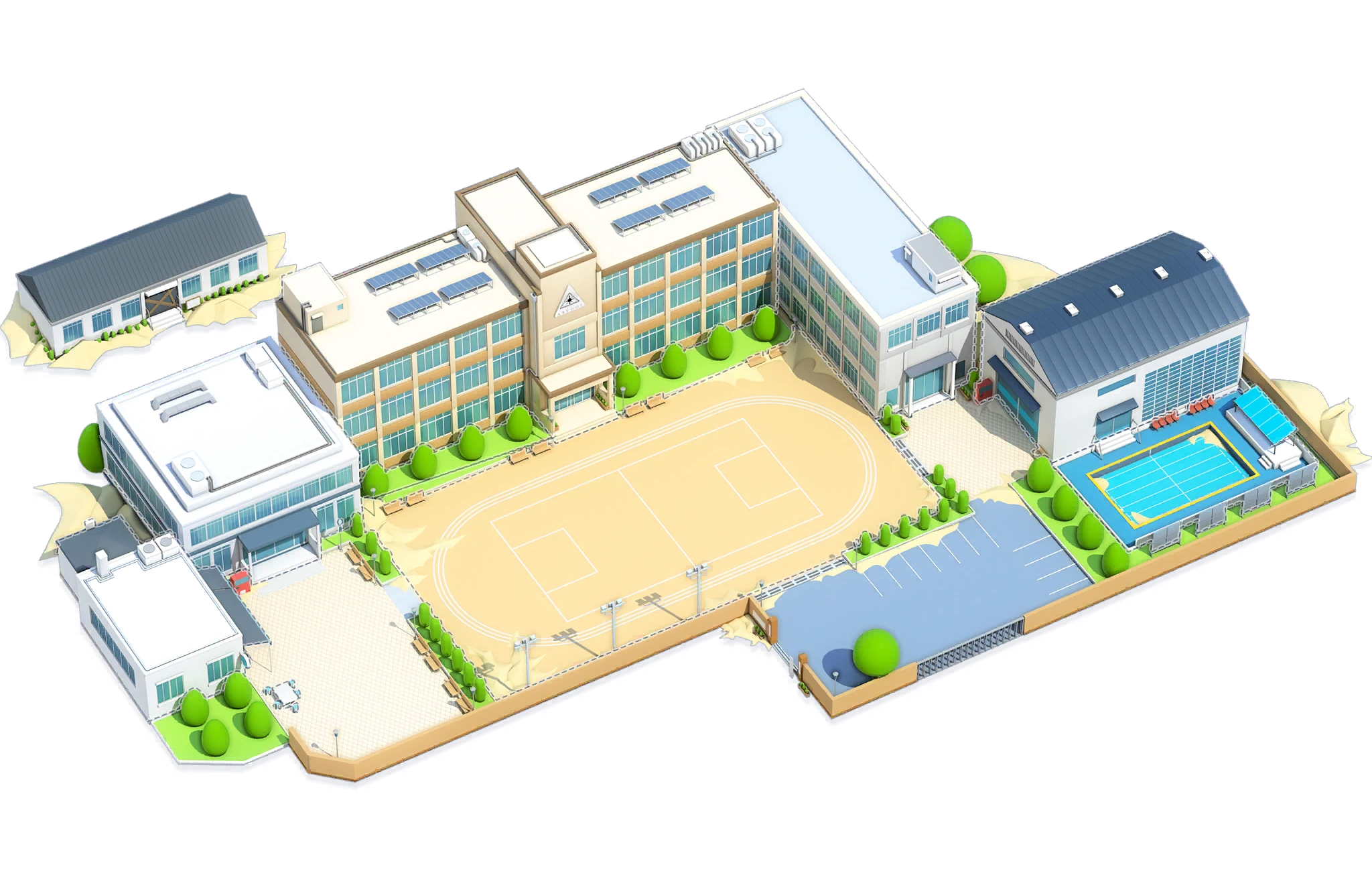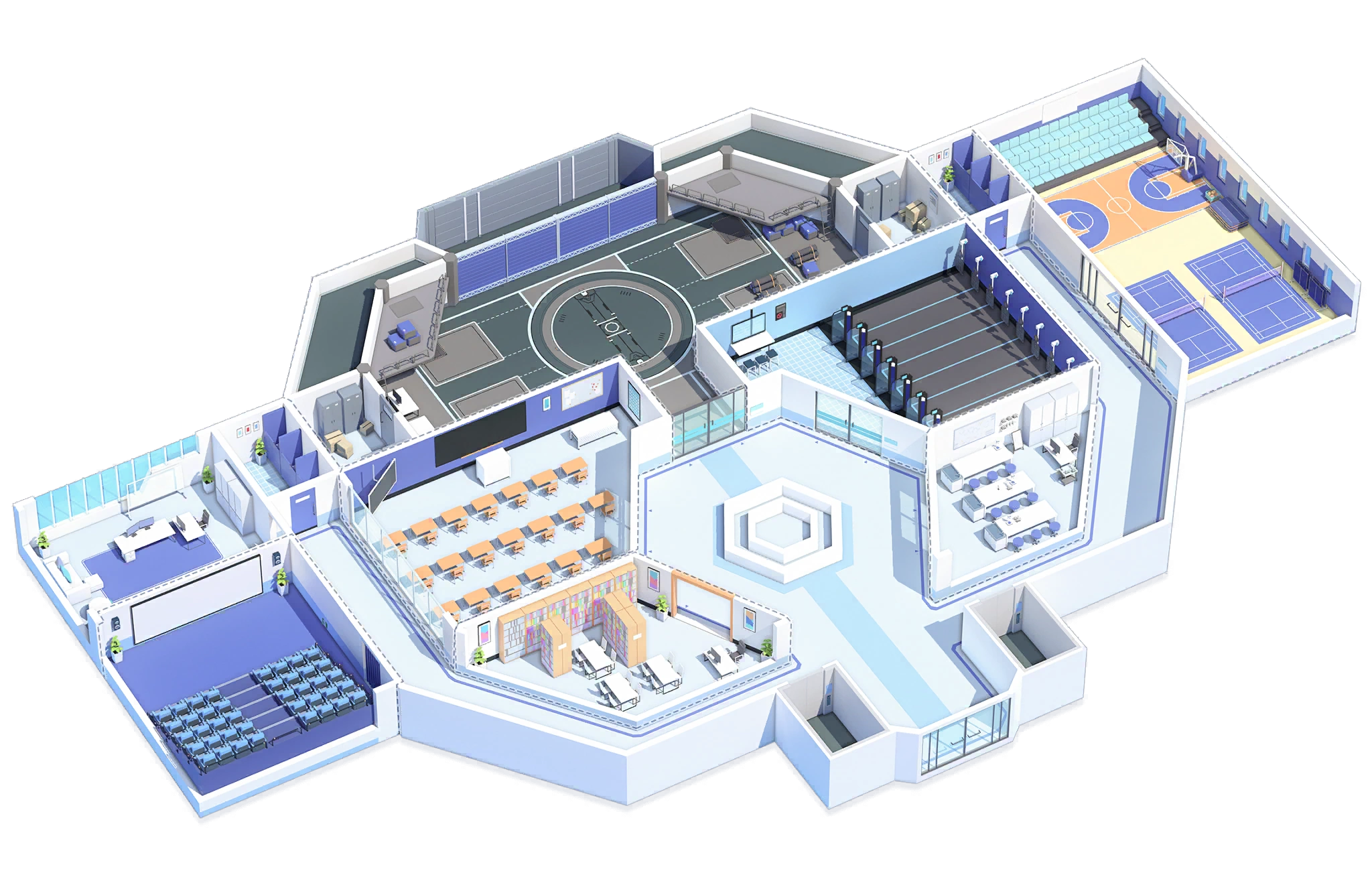 | This is an audio-visual room with a large screen for viewing visual media. You can watch various dramas, movies, and trendy anime. | It is a large gymnasium with spectator seating. It is also equipped with most of the sports equipment. | The library has a large collection of books, from study reference books for students to books for teachers' work. There are not only hard books, but also manga and light novels. | |