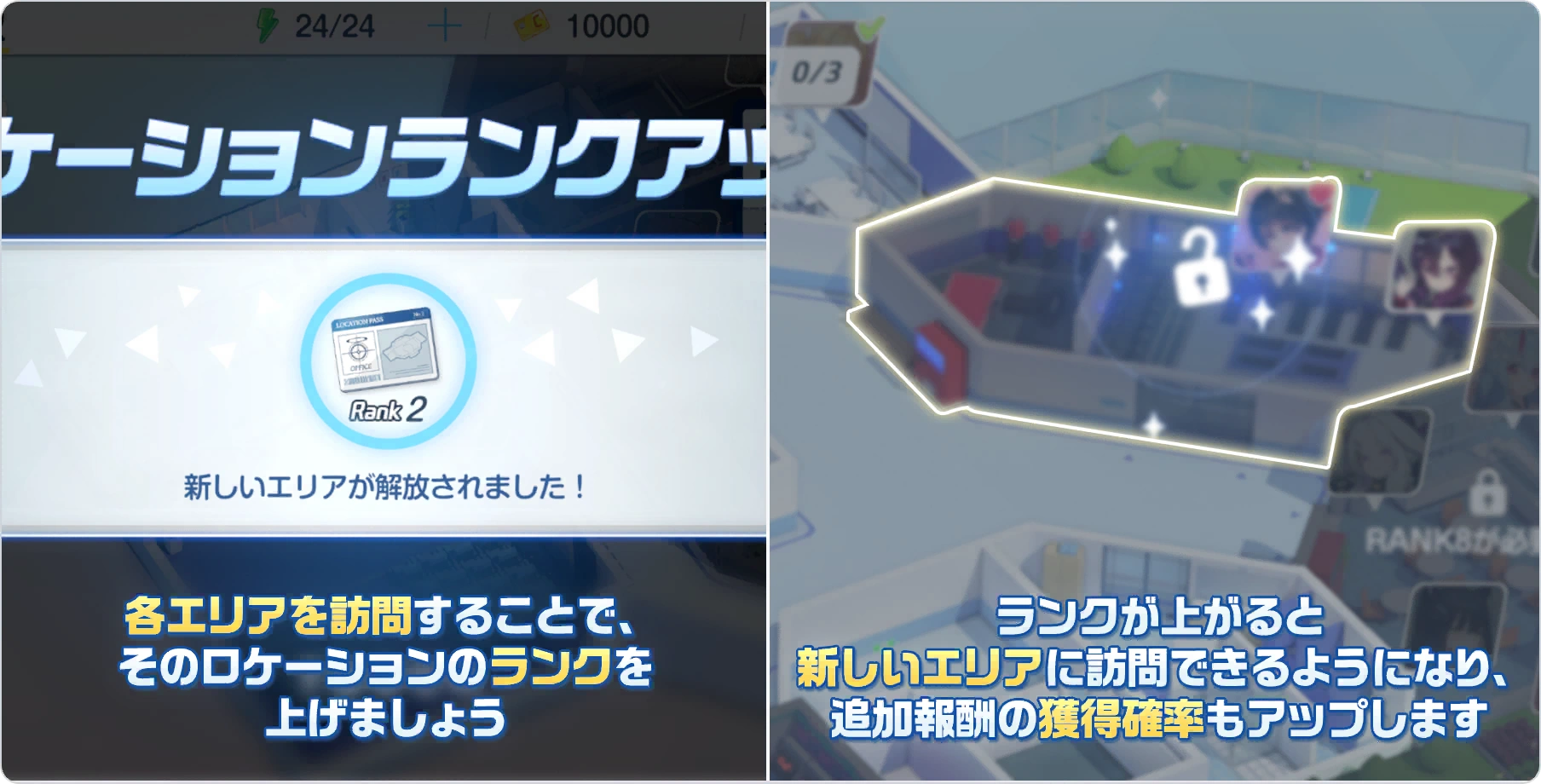 - The Rank bar at the top right will also increase by 100 Area EXP with every lesson conducted in that particular location.