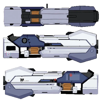 She uses a white railgun prototype provided by the Engineering Department. It has a yellow "core", a blue receiver and accelerator, and an LCD screen indicator located at the back of the weapon. Two front covers are present possibly to protect the accelerator barrel when on transport. It opens up when the weapon is ready to be fired. A Millennium insignia is stamped on the front housing. A Game Development Club logo is stickered below the LCD screen.