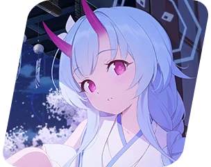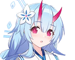 She has sky blue hair on shoulder length with two long braids on the back reaching her legs. She has oni horns on the forehead and red eyes.