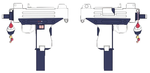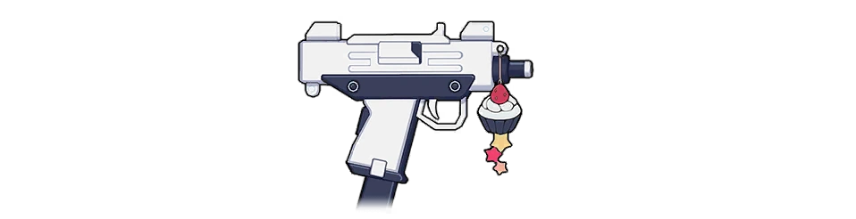 She uses a white IMI Micro Uzi machine pistol with a dark blue magazine and barrel nozzle. A cupcake strap is attached on the barrel.